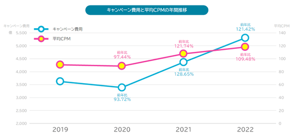 運用型ディスプレイ広告のキャンペーン費用と平均CPMの年間推移