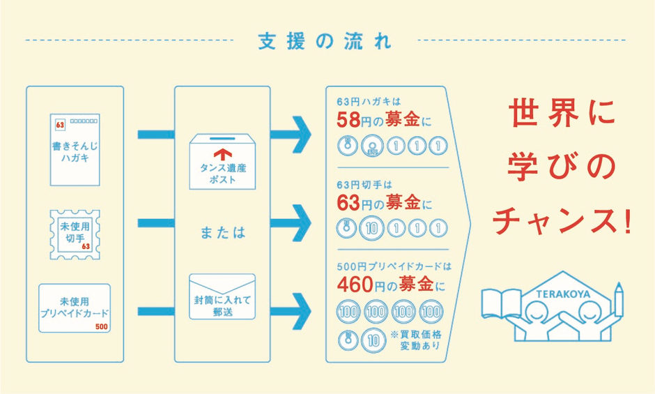 誰一人取り残さないための教育支援に、ご家庭で眠っている“タンス遺産”が貢献します。うっかり書きそんじてしまったハガキをはじめ、タンスの中に眠った商品券、未使用の切手・プリペイドカード(テレホンカード・図書カード等)を、"タンス遺産"と称し、それぞれのキャラクターに扮したタンス遺産3兄弟を起用して、支援を呼び掛けています。ぜひ、"タンス遺産"でユネスコ世界寺子屋運動にご協力をお願いいたします。