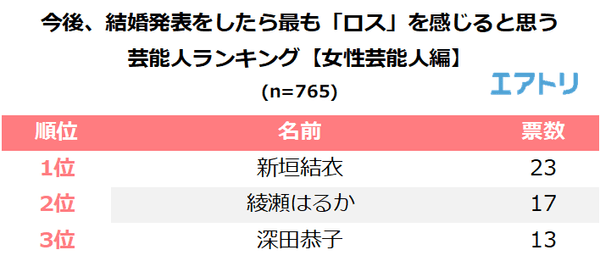 今後、結婚を発表したら最も「ロス」を感じると思う女性芸能人を聞いたところ、女優の「新垣結衣(23票)」が1位となりました。続いて2位は「綾瀬はるか(17票)」、3位は「深田恭子(13票)」が選ばれ、ドラマや映画で主演女優として多く活躍している30代の人気女優がTOP3を占める結果となりました。