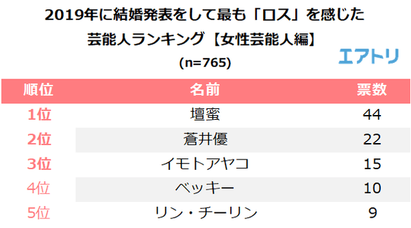 2019年に結婚発表をして最も「ロス」を感じた女性芸能人を聞いたところ、人気漫画家「清野とおる」と結婚した「壇蜜(44票)」が1位となりました。2位は南海キャンディーズの山ちゃんこと「山里亮太」と結婚した「蒼井優(22票)」、3位は出演番組の生放送で結婚を発表した「イモトアヤコ(15票)」でした。