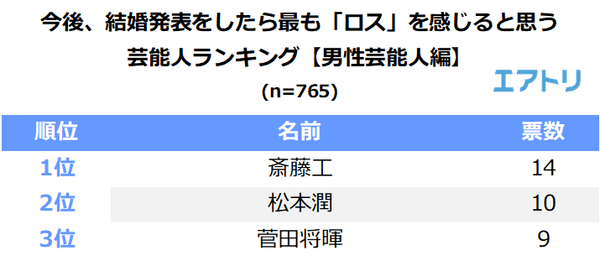 今後、結婚発表をしたら最も「ロス」を感じると思う男性芸能人を聞いたところ、1位は俳優の「斎藤工(14票)」となりました。2位は今年結婚を発表した二宮和也と同じグループに所属する「松本潤(10票)」、3位は人気若手俳優の「菅田将暉(9票)」となりました。