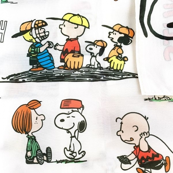 生地のアップです。スヌーピーだけでなく、チャーリーブラウンたちも勢揃い♪様々な表情が楽しめます。