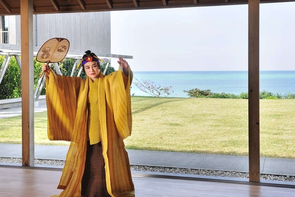 琉球王朝時代の夏の過ごし方を倣い、星のや沖縄の道場で琉球舞踊を鑑賞します。道場を貸し切って行うプラン限定の演目は、暑い夏の日を涼むために慣れ親しんでいる団扇への感謝を表す古典舞踊「作田(つぃくてん)」です。手に持つ団扇にも芭蕉布を使用する他、踊り手の衣装には特別展で展示されるほど貴重な芭蕉布の胴衣(ドゥジン)と裙(カカン)に、鮮やかな芭蕉布の着物を羽織ります。踊り手の優雅な舞と海からの涼やかな風をはらむ芭蕉布を愛でながら、琉球王朝時代に想いを馳せる、この上ない時間を過ごします。