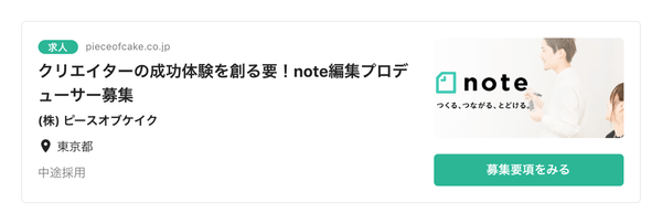 note に各種求人ページへのリンクがわかりやすく表示される機能です。求人ページのURLを note 記事に貼ると、募集職種や勤務地、雇用形態といった情報がカード形式で表示されます。