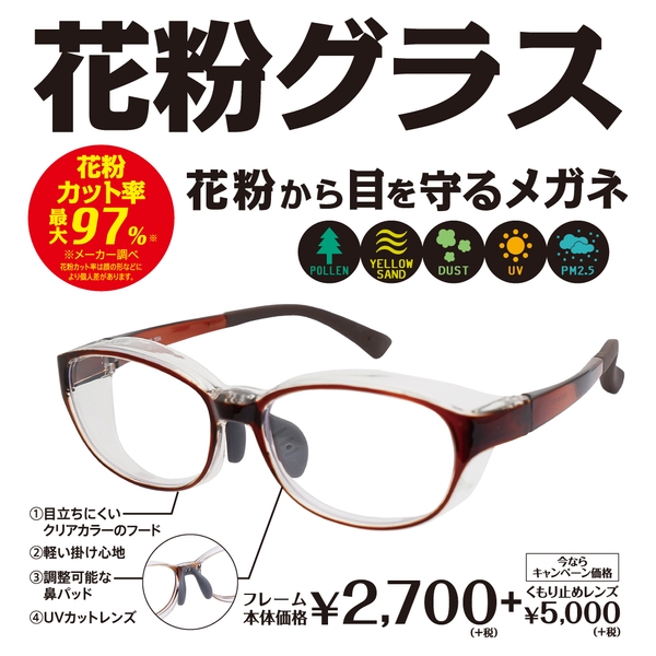 花粉に悩まされている方は、外出が憂鬱になっていることではないでしょうか。そんな皆さんの悩みを解決すべく、くもり止めUVカット付きレンズ(度無し)を装備した、ミキの花粉メガネを¥2,700+税にて販売いたします。またセール期間中はプラス¥5,000+税のキャンペーン価格(通常¥6,000+税)にて、度付きレンズに変更が可能となっています。ぜひこの機会にご利用ください。