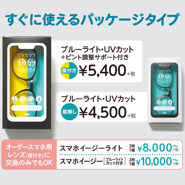 スマホなど近くを見るときに目の負担を軽減させるため、レンズ下部には目のピント調整をサポートする「リラックスゾーン」を、レンズ上部には、裸眼と同じように遠くを見ることができる「クリアゾーン」を設けています。すぐに使える既製のパッケージタイプ(度付き、度無し、2タイプ)と、使う方の度数に合わせてオーダーが可能なレンズ(レンズ交換のみも可)がございます。