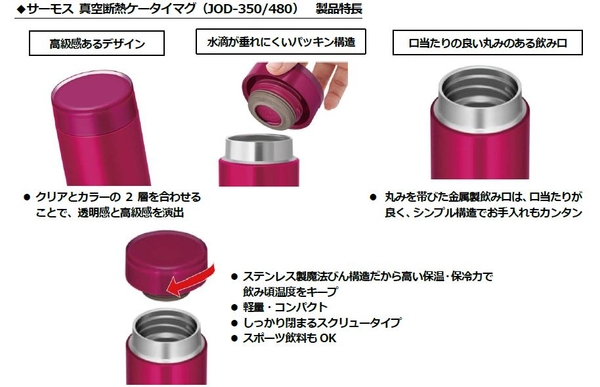 新製品の『サーモス 真空断熱ケータイマグ(JOD-350/480)』は、丸みを帯びた金属製飲み口なので口当たりが良く、フタは水滴が垂れにくいパッキン構造を採用しました。