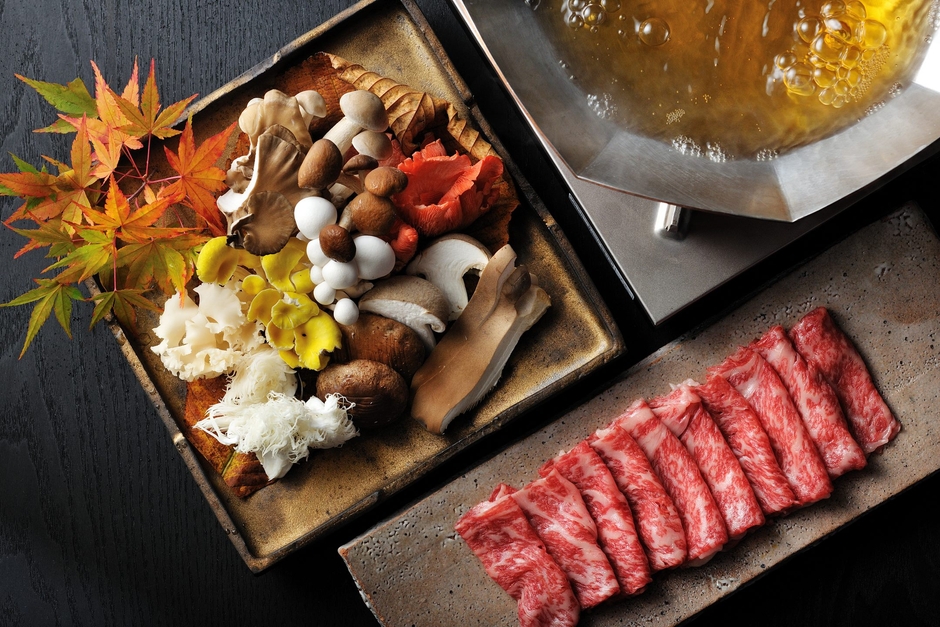 星のや軽井沢のメインダイニング「日本料理 嘉助」にて、「きのこの特別鍋会席」を用意します。メインは「きのこと牛肉のしゃぶしゃぶ」。きのこから出る深みのある出汁で肉を味わう、きのこの旨味が主役の料理です。その他、先付けではシャキシャキとした食感を、椀代りではきのこの香りを楽しめるなど、その時期に採れたきのこを使い、料理ごとに異なる味わいや食感が楽しめる献立です。