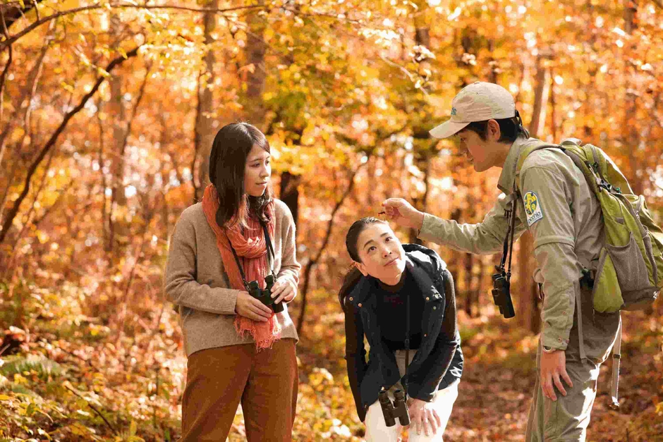 星のや軽井沢に隣接する「軽井沢野鳥の森」を散歩しながら、きのこの生態について学ぶ約1時間のツアーです。軽井沢で自然観察ツアーを行っている「ピッキオ」のスタッフの解説を聞きながら、きのこを見たり、匂いを嗅いだり、触ったりしながら、道を進んでいきます。きのこの生態を知ることで、きのこへの興味が高まります。