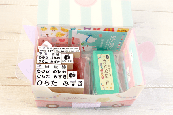 セット内容:お名前スタンプ16本、ぷちスタンプ1本、マルチスタンプパッド、バーサクラフトインク、インク溶解液、収納ケース(デコシールつき)料金:3,950円(税込・送料無料)