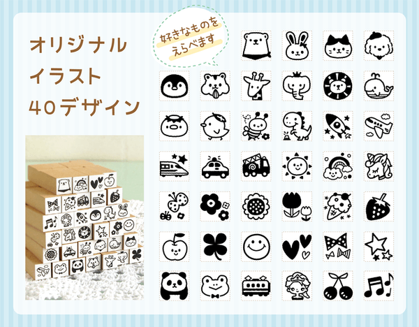 当店オリジナルのイラストは35種類から40種類に。今回のリニューアルに合わせてすべて一新しました。お好きなイラストを選ぶことができ、さらにお子さまのお名前が入るイラストスタンプも仲間入り。イラスト入りのお名前スタンプなので、これひとつでもカワイく名前つけができます。また、イラストのみのスタンプも付いているため、文字の読めないお子さまのマイマークとしても最適です。