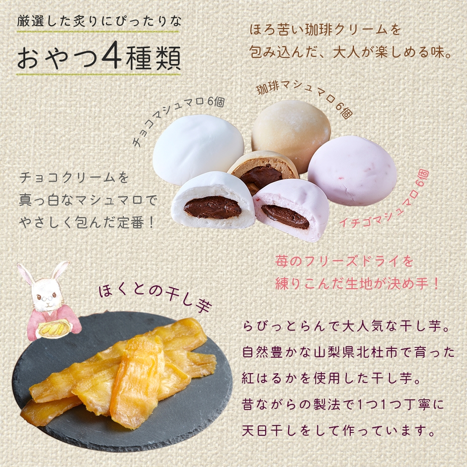 内容量 【あぶり師】1個、【チョコマシュマロ】 6個、【珈琲マシュマロ】 6個、【イチゴマシュマロ】 6個、【ほくとの干し芋】 200g