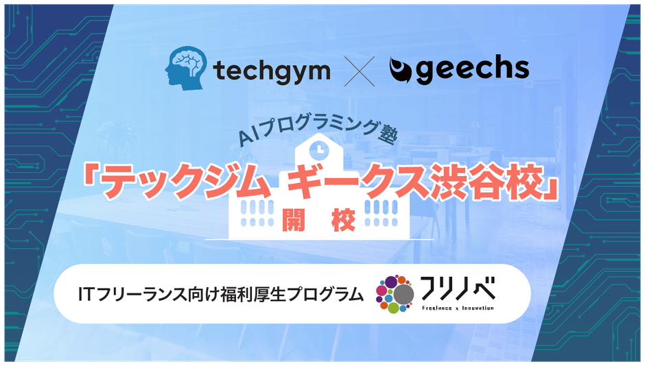 ギークス株式会社(本社:東京都渋谷区、代表取締役社長:曽根原 稔人、以下ギークス)は、ITフリーランス向けAIプログラミング塾「テックジム ギークス渋谷校」を2月6日(木)に開校することをお知らせします。本校は、ITフリーランス向けにAI技術の学習機会の提供とスキルアップ支援を目的に、AI・Pythonスクールを運営するテックジム株式会社(本社:東京都港区、代表取締役:鈴木 貴大)との提携により実現したものです。
