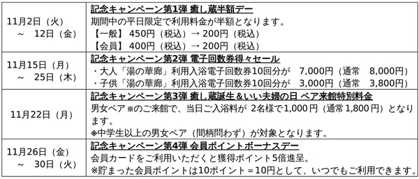 日ごろのご愛顧に感謝し、記念キャンペーンを実施いたします。これを機に、つかしん天然温泉「湯の華廊」およびリラクシングスペース「癒し蔵」へのご来館をお待ちしております。