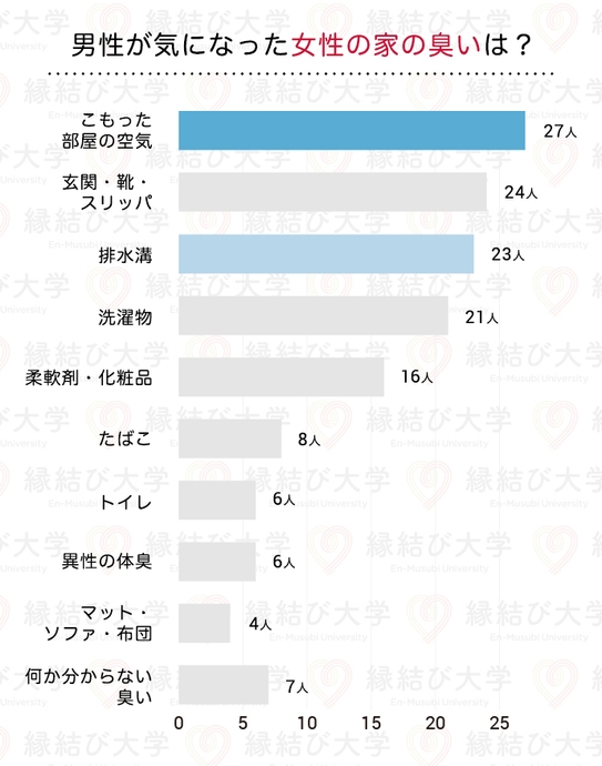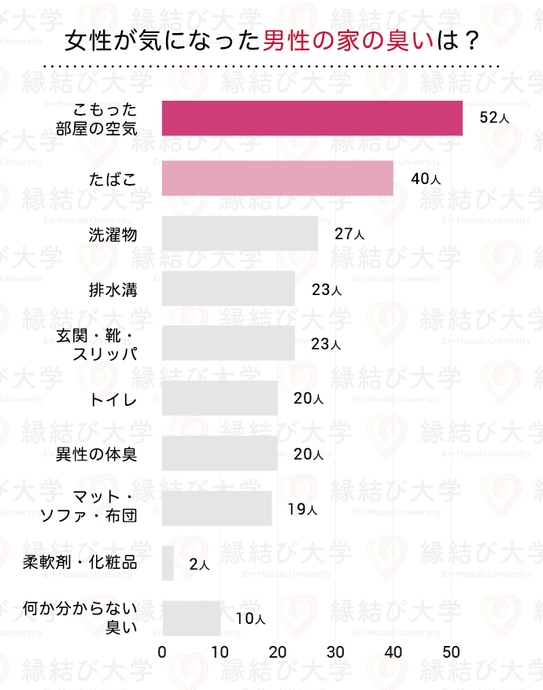 株式会社ネクストレベル(本社所在地:神奈川県横浜市、代表取締役:田中大洋)が運営する『縁結び大学』(https://jsbs2012.jp/date/)は、18歳~40歳の独身男女181名を対象に「異性の部屋に行ったときに気になった部屋の臭い」についてアンケートを実施しました。 その結果、7割以上の人が”自宅の臭いに気付いていない”ということが判明しました。男女ともに気になる臭い、男女の捉え方の違いなど、詳しい情報をお伝えします。