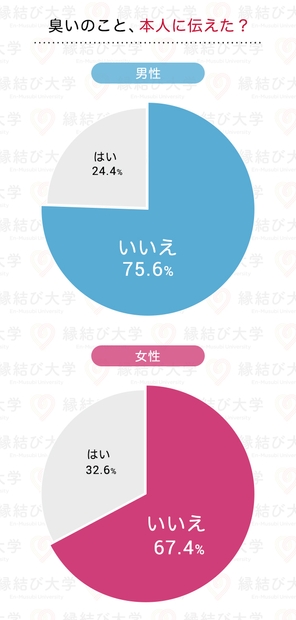 気になった臭いについて実際に部屋の住人である本人に伝えた人は、男性が24.4%、女性が32.6%と、男性の方が少ないようです。