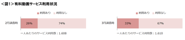 ☑ 有料動画サービスの利用状況は2月調査時から3月調査時で26%から33%と127%増加。一方、一人あたりのサービス利用数に変化はみられなかった。<図1>