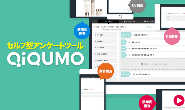 「QiQUMO」は調査画面作成や、結果の回収をご自身で操作するセルフ型アンケートツール(DIYリサーチツール)です。