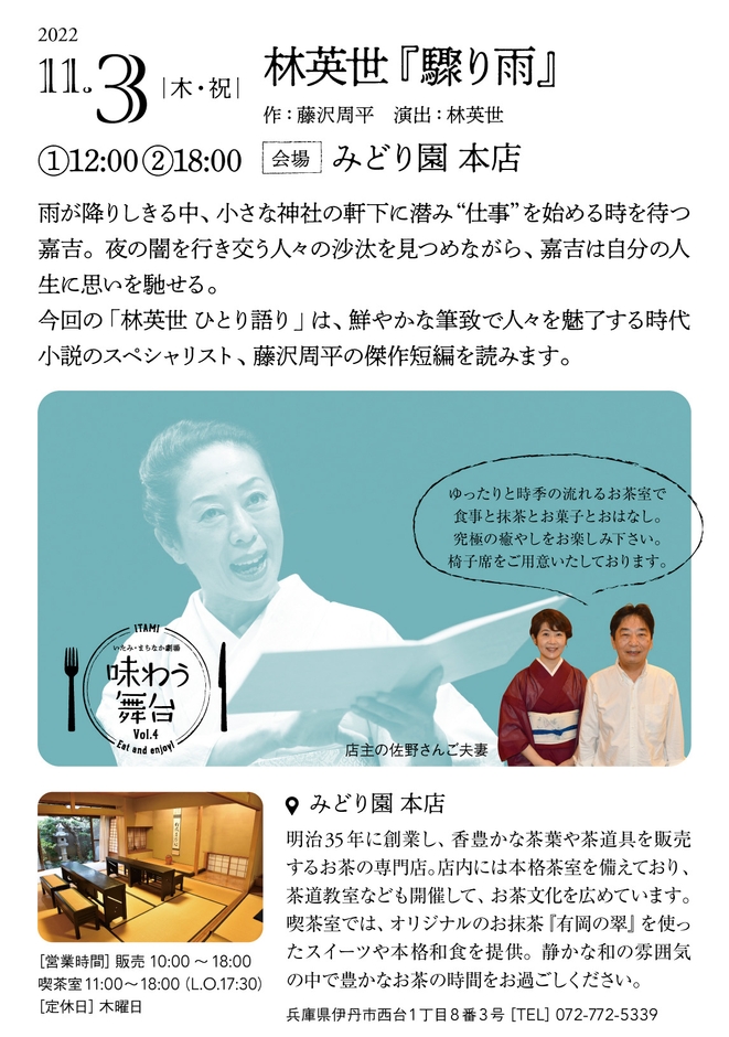 林英世 ひとり語り 藤沢周平『驟り雨』2022年11月3日 (木・祝) / みどり園 本店(兵庫県伊丹市西台1丁目8番3号)
