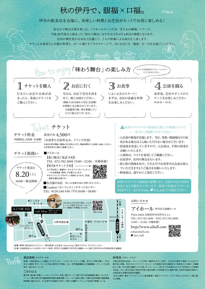 出演者・公演内容は会場ごとに異なり、「cafe Mon」では、京都を中心に活動しているニットキャップシアター代表のごまのはえが、伊丹で実際にあったエピソードを元に描いた『イタミ・ノート』を女優・髙安美帆が演じます。また、「みどり園 本店」では、女優・林英世による藤沢周平の傑作短編『驟り雨』の朗読(ひとり語り)があります。