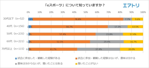 一方で、「意味は分からないが、聞いたことはある」と回答した人も多くおり、(30代:7.7%、40代17.3%、50代:23.8%、60代:29.4%、70代以上:37.4%)eスポーツというキャッチーな名称だけが独り歩きをしてしまっている印象も受けます。