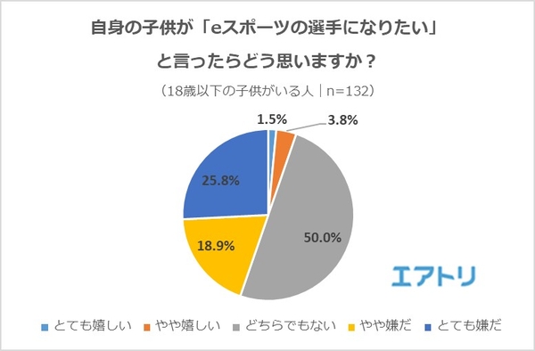 18歳未満の子供がいる親に対し、自身の子供が「eスポーツの選手になりたい」と言ったらどう思いますか?と聞いたところ、「どちらでもない」が50.0%で最多となりました。「とても嬉しい」「やや嬉しい」は5.5%だったのに対し、「とても嫌だ」「やや嫌だ」は44.7%と圧倒的に多く、「どちらでもない」の回答には「本当は嫌だけど、子供がやりたいことは応援したい」という親心を感じました。