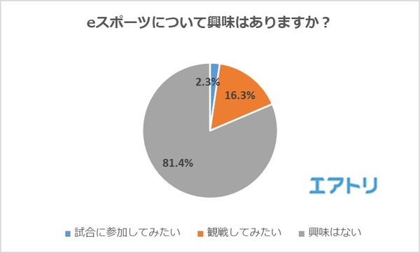 大多数が「興味はない」(81.4%)と回答し、「試合に参加してみたい」は2.3%、「観戦してみたい」は16.3%に留まりました。先述のとおり、eスポーツという名称自体は浸透しているものの、その具体的な内容や魅力についてはまだ多くの人の元には届いていないようです。