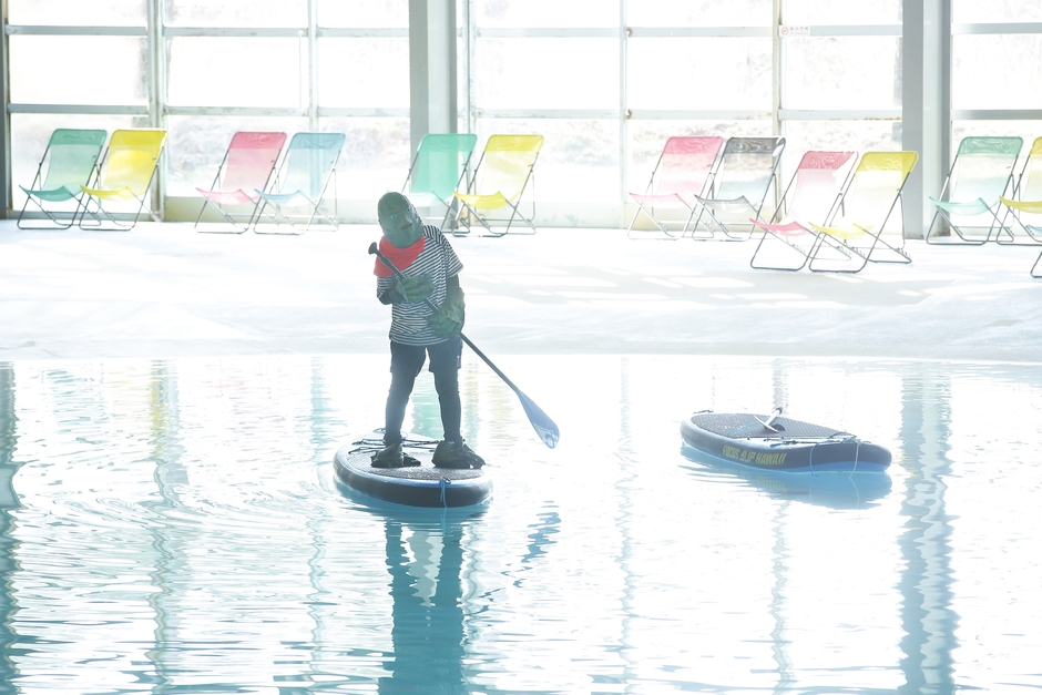 屋内プール「il mare(イルマーレ)」では、半魚人が専属コーチをする「SUPデビューサポート」を行います。おもてなし特訓で培った接客スキルをSUPのレクチャーにも生かします。SUPとは「スタンドアップパドルボード」の略称で、ボードの上に立ちパドルを漕いで水面を進んでいくアクティビティ。オープン前のプールを貸し切り、広い空間で楽しめる贅沢な体験です。水遊びが得意な半魚人がコーチになり、パドルの使い方や波の乗り方を教えます。ジェスチャーのみでレクチャーするため、飛沫感染の心配もいりません。