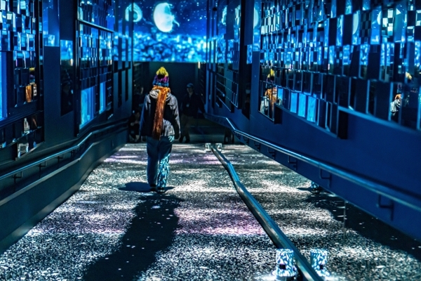 今季冬の展示「雪とクラゲ」では、約50メートルに渡って壁と天井が5,000枚の鏡で囲まれた万華鏡トンネル内にある、8 個のクラゲ水槽や壁面および床に都会の雪景色が感じられる映像演出を施し、雪とクラゲが調和した幻想的な光景に没入していただくことによる、今までにないクラゲの観賞体験を提供いたします。