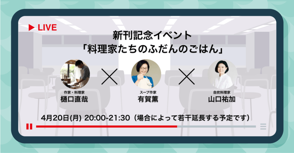 noteで人気の料理家3人が3月に新しく書籍を発売したことを記念したイベントです。3人それぞれの新刊の裏話、推しの食べ物、普段使っている調味料などを話しながら、有賀さんと山口さん、樋口さんが一汁一菜+主菜一皿の晩ごはんをつくる予定です。