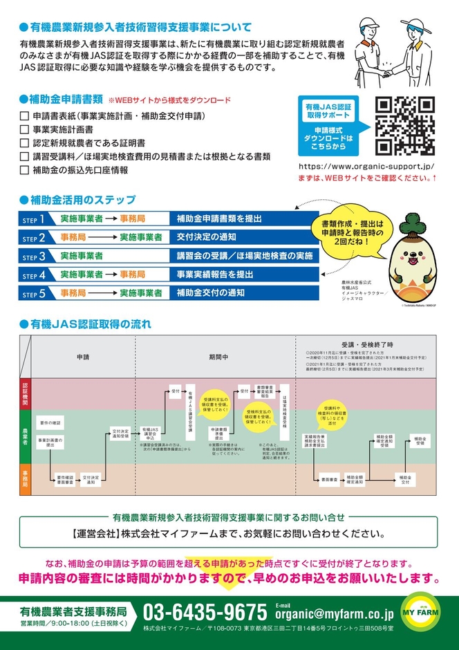株式会社マイファーム(京都府京都市、代表取締役西辻一真)は、 農林水産省の令和2年度有機農業新規参入者技術習得支援事業 を活用し、新たに有機農業に取組む農業者に対し、有機JAS 講習会の受講や 有機 JAS におけるほ場実地検査の検査料の支援を実施する運びとなりましたので、お知らせいたします。