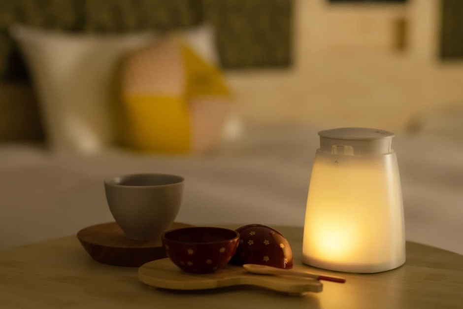 御祈願を受ける前日の夜、お泊まりになるお部屋でストレッチを行います。身を清めるとされるお香を焚き、身体に優しいカフェインレスの「京番茶」ともに、自分だけの静かな空間で心身を整えます。ストレッチは、呼吸法に加え「まんだら」が表す「〇」を取り入れた動きで構成。日常生活でたまった心身の疲れをおやすみ前に解きほぐします。