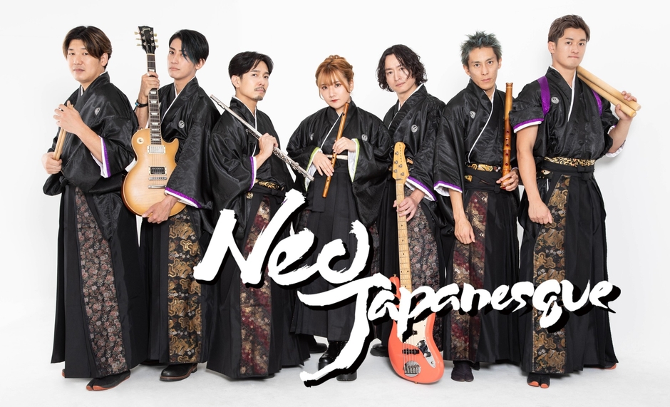 和楽器(和太鼓・篠笛・尺八)と洋楽器(ギター・キーボード・ベース・ドラム)で構成された7人編成のバンド、ネオジャパネスク( https://www.110107.com/neojapanesque )は、名古屋を中心にライブ活動を続けながらアジア・アメリカでライブを行い、これまでに全米で4枚の自主CDをリリース。2017年には2週間にわたるアメリカツアーを敢行。2019年にはデトロイトの美術館で2日間のワンマンライブ。2020年には台湾Ten Drum Festival 出演など海外での活動に加え、2024年にはSUGIZOとの共演や神野美伽と家島天神祭での共演など数多くのイベント等に出演。ドラム、ベースと和太鼓の音圧、疾走感あふれるギター、尺八と篠笛・フルートの美しい響き、キーボードが織りなすコードセンス。メロディアスでありながら、エッジが効いて身体の芯に響いてくる重厚さを備えたサウンド。 スピード感あふれる演奏と、細やかでありながら堂々たるパフォーマンスなど、新しい音楽性を通し千変万化に表現する。