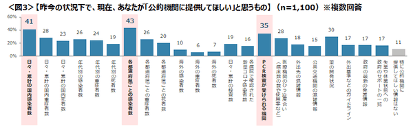 公的機関から提供してほしい情報は、「都道府県別感染者数」が最も高く、次に「国内感染者数」「PCR検査を受けられる機関」の情報が続く。日々の感染者状況や、いざ自分に感染の可能性がある際の対処に関する情報の提供が特に求められていることが分かる<図3>