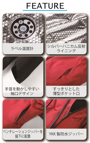 【仕様】 (充填物)エアロゲル複合材/(表地)撥水性ポリエステル/(裏地)ポリエステル(シルバーハニカムリフレクティブ)/YKK防水ファスナー