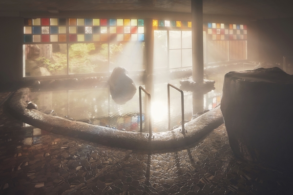 どさ湯さプランで宿泊した方全員に、日帰りで青森屋の温泉に入れる利用券をプレゼントします。日帰りで利用できるのは、敷地内にある元湯。大きな窓に光が差し込み、津軽びいどろガラスが湯面を彩る、レトロな雰囲気の岩風呂です。湯ざわりとろとろの熱めのお湯に浸かり、昔から通う地元の方々と交流できます。旅行が終わった後も、青森屋の温泉を楽しめます。