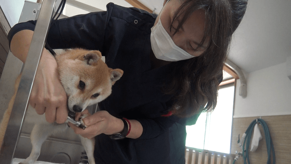 子犬100頭や成犬を遊ばせながら運動をさせ、合間に健康チェック、爪切りなどをしていく渡邉さん。