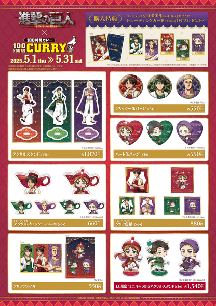 全国約50店舗展開しているカレー専門店「100時間カレー」を運営する株式会社アークス(本社:東京都豊島区、代表取締役:米田周平)は、2025年5月1日(木)~5月31日(土)の期間、全世界でシリーズ累計発行部数1億4000万部を突破した、ダークファンタジーの金字塔作品である人気TVアニメ『進撃の巨人』とのコラボレーションキャンペーンを全国の100時間カレーで実施いたします。