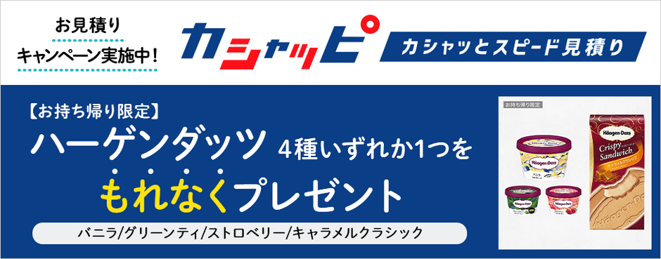 また、2019年11月7日~2019年12月31日の期間に、「カシャッピ」のサービスを利用してSBI損保の自動車保険をお見積りいただき、マイページ登録をされた方を対象に、ハーゲンダッツ(お持ち帰り限定)4種いずれか1つをもれなくプレゼントするキャンペーンを実施いたします。キャンペーンの詳細は、当サービスご案内ページをご確認ください。