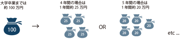 卒業までに約100〜120万円→4年間で卒業を目指す場合は、1年間の学費が約25万円