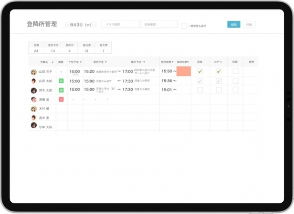 児童毎の下校時間・降所時間、登降所方法などが一覧で表示され、降所時間順/出席番号順など並び替えも自由に行えるため、児童管理の効率が大幅に向上します。