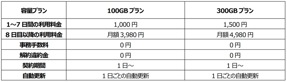 「i WiFi」はたっぷり使える100GB・300GBの2種類のプランを用意。1日から利用可能で、1日~7日間のレンタルは、何日でも一律1,000円(送料別)で100GB使い放題となります。8日目以降は月額料金へ移行しますが、1ヵ月以内の返却もでき、日割り精算で解約違約金も発生しませんので、無駄なお金を支払う必要がありません。10:00~18:00のご予約で即時発送、東京23区内は3時間お届けパックでの発送のため、最短3時間以内でお届けが可能です。その他、端末専用パスワードの発行や全額返金保証(初回限定)など、「安定」「安心」「安価」にご利用いただける体制を追及しました。