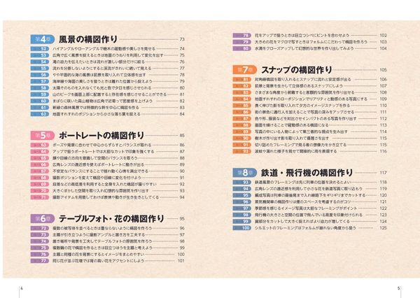 撮影する機会には恵まれているが、それだけに悩みも多い風景撮影。なかなか撮れないために、思うように上達できないポートレート撮影。被写体の配置換えなどの作り込みが効くため、迷いも生じてしまうテーブルフォト。貴重な出会いをモノにしたいスナップ。カメラの軽量化やAF性能の向上により、人気が出てきた鉄道・飛行機。これら各シチュエーションですぐに活用したくなるテクニックやヒントを紹介しています。