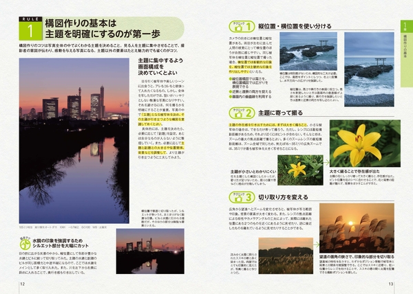 本書では一般的な撮り方による作例と、各ルールの基本テクニックに沿って撮影された作例を比較掲載。各ルールの狙いとするところを、視覚的にわかりやすく提示しています。ルールによっては、さらに応用編ともいえる詳細テクニックも解説しています。