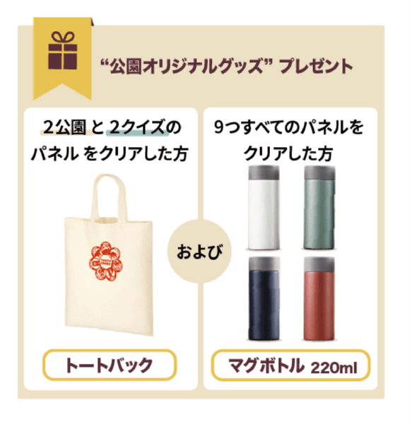クリア条件を満たした方には対象公園のサービスセンターにて公園オリジナルグッズを差し上げます(なくなり次第終了)。