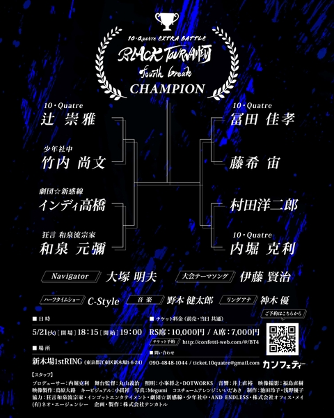 株式会社テンカトル(代表:内堀克利)企画制作、『BLACK TOURNAMENT ~fourth break~』が2024年5月21日 (火)に新木場1stRING(東京都 江東区 新木場 1-6-24)にて開催されます。