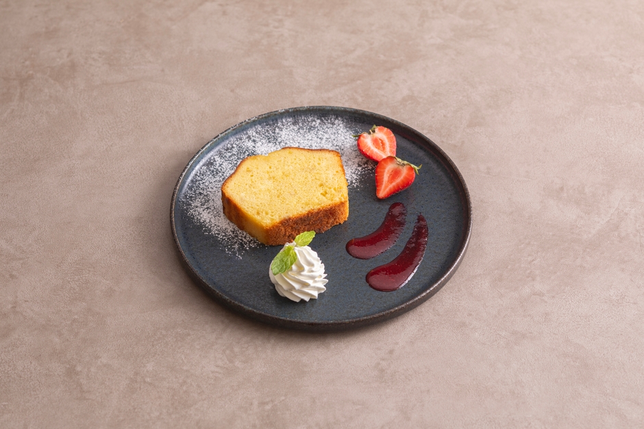はちみつレモンのしっとりとしたパウンドケーキにホイップやいちごを添えたデザートプレートです。