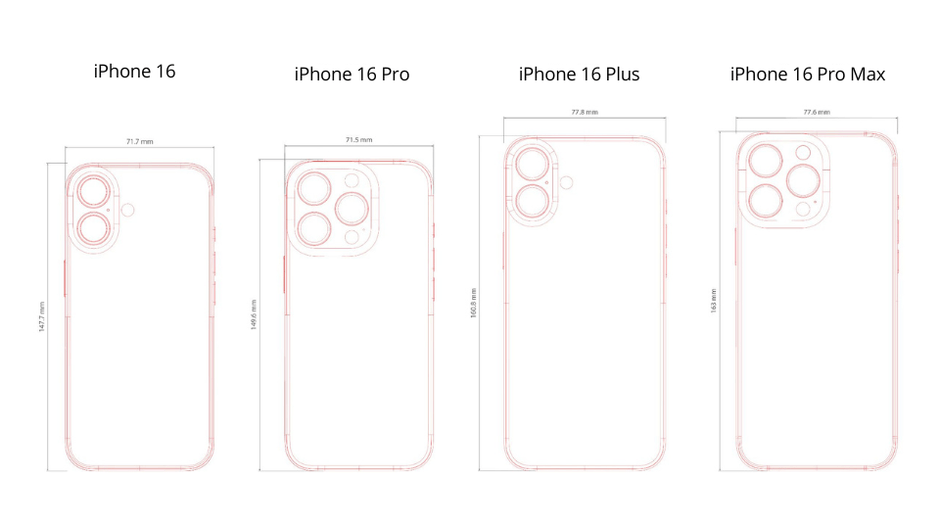 iPhone 16シリーズ4機種では、前面の大きさも異なるため、ケースにはそれぞれ専用のものが必要です。また、iPhone 15シリーズと比較しても背面や側面にも大きな違いがあります。