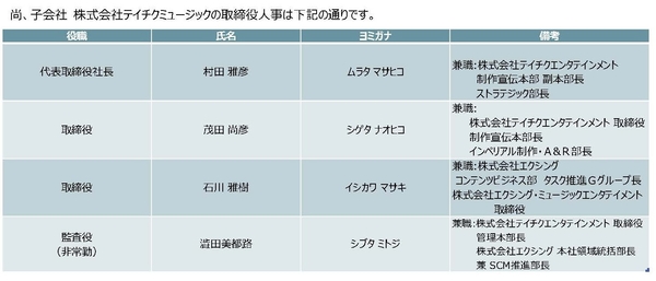 株式会社テイチクエンタテインメント 及び 子会社(株式会社テイチクミュージック)の 代表取締役及び取締役人事について