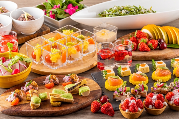 富士山の豊富な湧水で育った「富士山サーモン」や、ふっくらと脂ののった焼津名産のなまり節など、静岡ならではの名物を活かした春を彩る前菜やスープなどがブッフェスタイルで並びます。メイン料理は、富士山麓の清らかな水と空気、温暖な気候のもとで育った「しずおか和牛」や沼津港直送の季節魚などのグリル料理からお選びいただけます。シェフ特製の椎茸や山葵クリームチーズのガーリックソースとともにお楽しみください。
